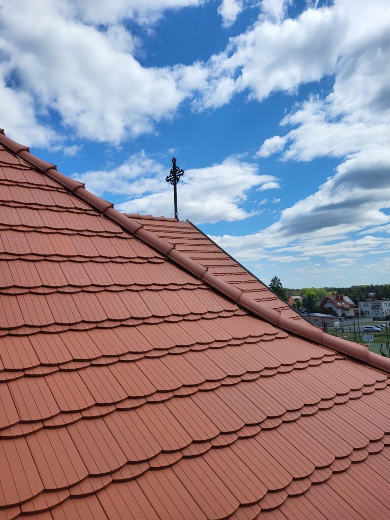 W ramach zadania wykonano całkowicie nowe deskowanie połaci dachu i pokrycie papą (wcześniej nie było), nowe z blachy tytanowo-cynkowej obróbki blacharskie, orynnowanie, rury spustowe, kosze , nowe kontrłaty i łaty oraz zamontowano nową dachówkę karpiówkę w koronkę i gąsiory.